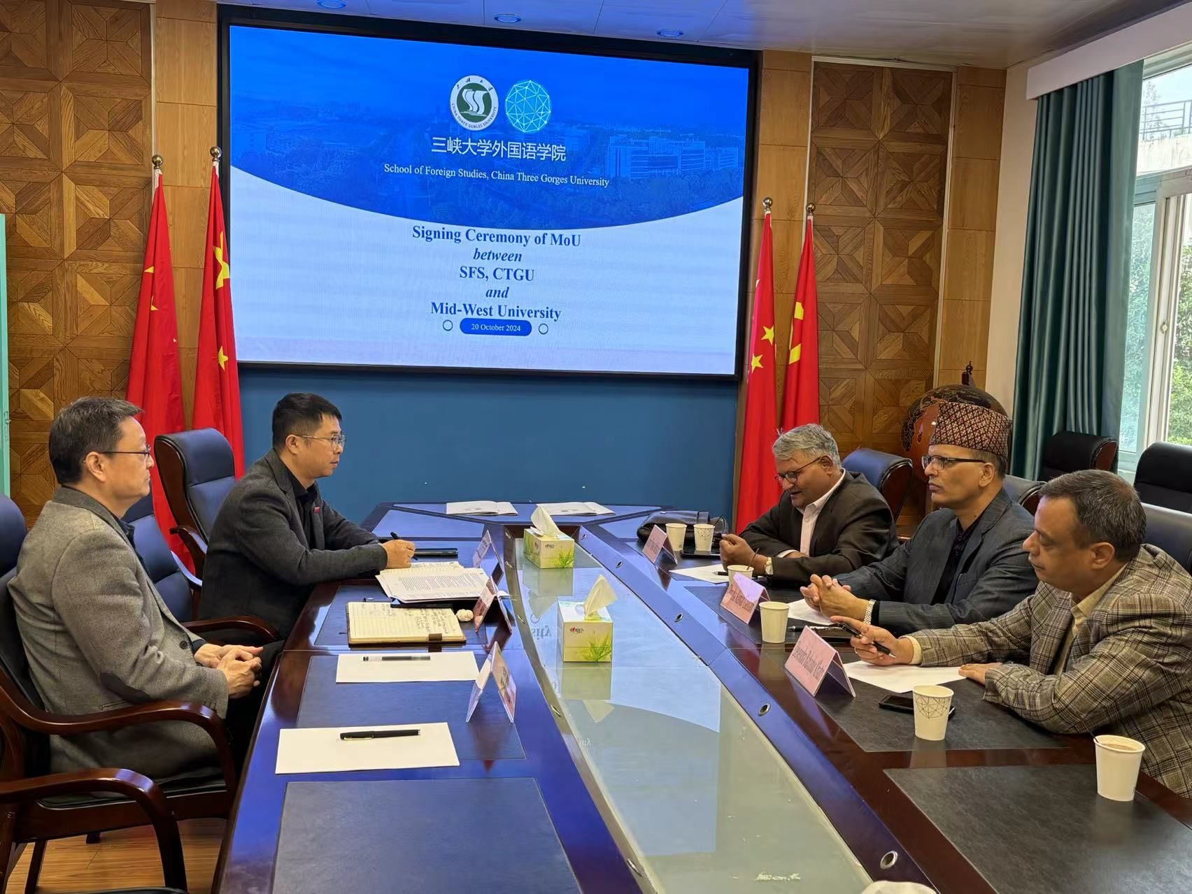 2024年10月20日,三峡大学外国语学院学院与尼泊尔Mid-West University、Nepalese Army Institute of Health Sciences两所高校代表商谈教育交流合作。学院院长席敬、党委委员胡新颖、教师谭啸等参加了会谈。
