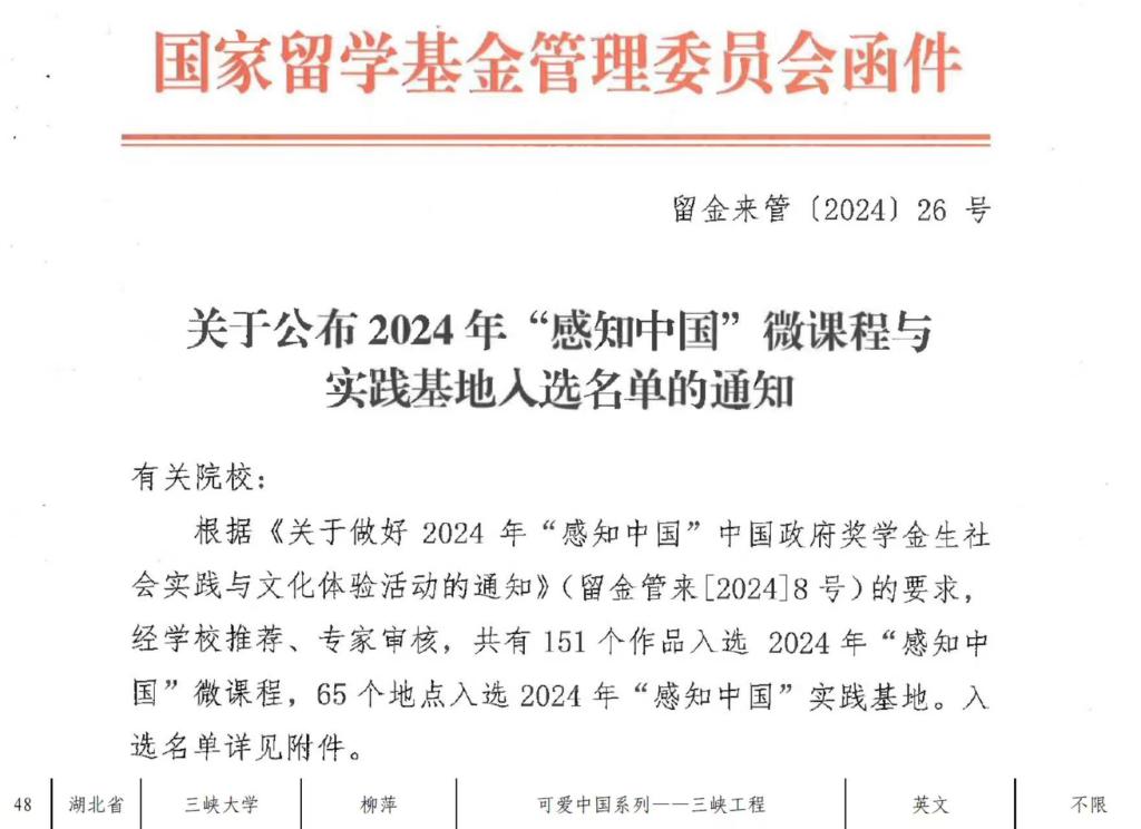 近日,国家留学基金管理委员会公布了2024年“感知中国”微课程入选名单。中心研究人员柳萍老师申报的《可爱中国系列--三峡工程》微课程入选2024年“感知中国”微课程名单,这是中心在人才培养方面的又一重要突破。