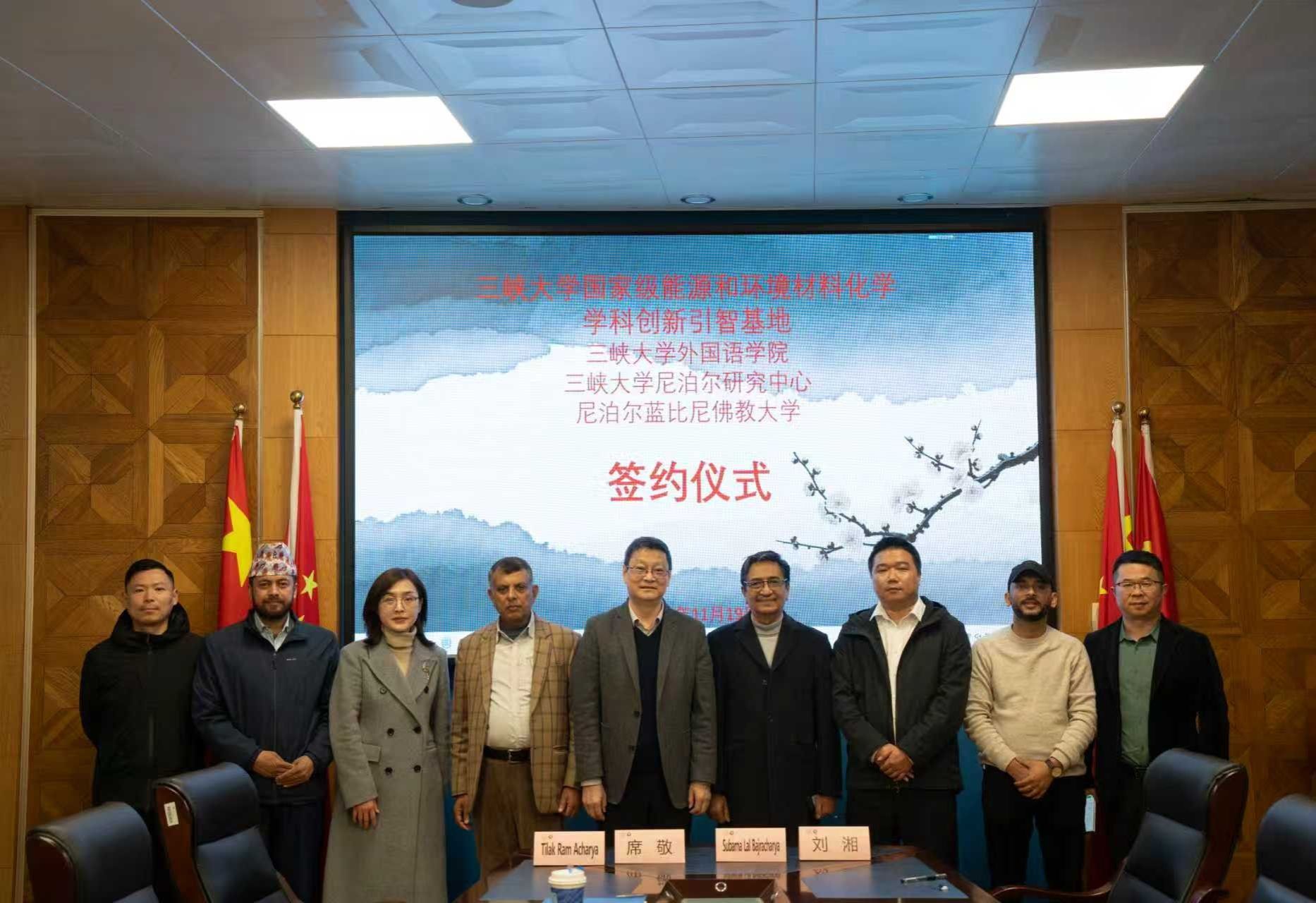 签约仪式由三峡大学外国语学院院长、尼泊尔研究中心主任席敬教授主持。三峡大学外国语学院副院长屈琼、党委委员胡新颖、党政办公室主任余征,以及国家级能源和环境材料化学学科创新引智基地主任刘湘教授共同出席仪式。